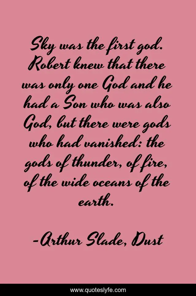 This page presents the quote "Sky was the first god. Robert knew that there was only one God and he had a Son who was also God, but there were gods who had vanished: the gods of thunder, of fire, of the wide oceans of the earth.". Author of this quote is Arthur Slade, Dust. .