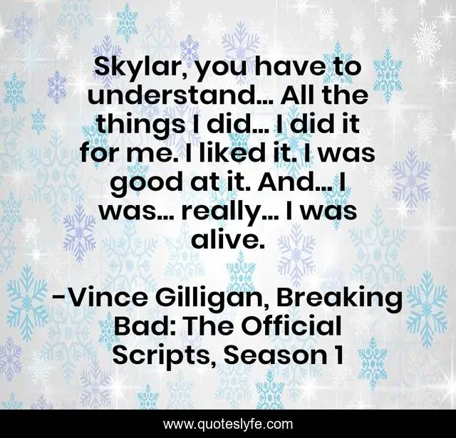 This page presents the quote "Skylar, you have to understand... All the things I did... I did it for me. I liked it. I was good at it. And... I was... really... I was alive.". Author of this quote is Vince Gilligan, Breaking Bad: The Official Scripts, Season 1. .