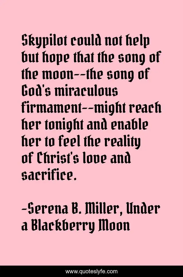 This page presents the quote "Skypilot could not help but hope that the song of the moon--the song of God's miraculous firmament--might reach her tonight and enable her to feel the reality of Christ's love and sacrifice.". Author of this quote is Serena B. Miller, Under a Blackberry Moon. This quote is about jesus-christ, love, god, sacrifice, hope, inspirational, enthusiasm, salvation, affection,.