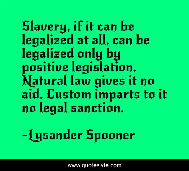 This page presents the quote "Slavery, if it can be legalized at all, can be legalized only by positive legislation. Natural law gives it no aid. Custom imparts to it no legal sanction.". Author of this quote is Lysander Spooner. This quote is about positive, confidence, law, slavery,.