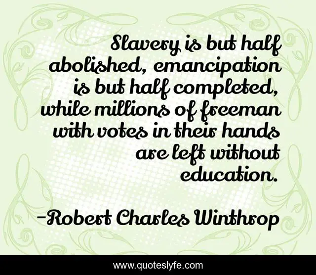 This page presents the quote "Slavery is but half abolished, emancipation is but half completed, while millions of freeman with votes in their hands are left without education.". Author of this quote is Robert Charles Winthrop. This quote is about without, slavery, hands,.