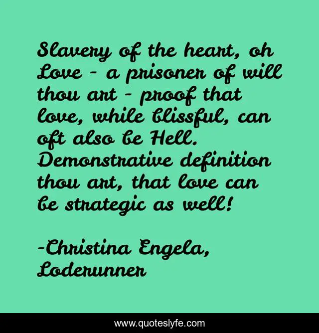 This page presents the quote "Slavery of the heart, oh Love - a prisoner of will thou art - proof that love, while blissful, can oft also be Hell. Demonstrative definition thou art, that love can be strategic as well!". Author of this quote is Christina Engela, Loderunner. This quote is about definition, love, heart, slavery, strategic, prisoner, hell, blissful, affection,.