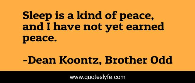 This page presents the quote "Sleep is a kind of peace, and I have not yet earned peace.". Author of this quote is Dean Koontz, Brother Odd. This quote is about peace, sleep, odd-thomas,.