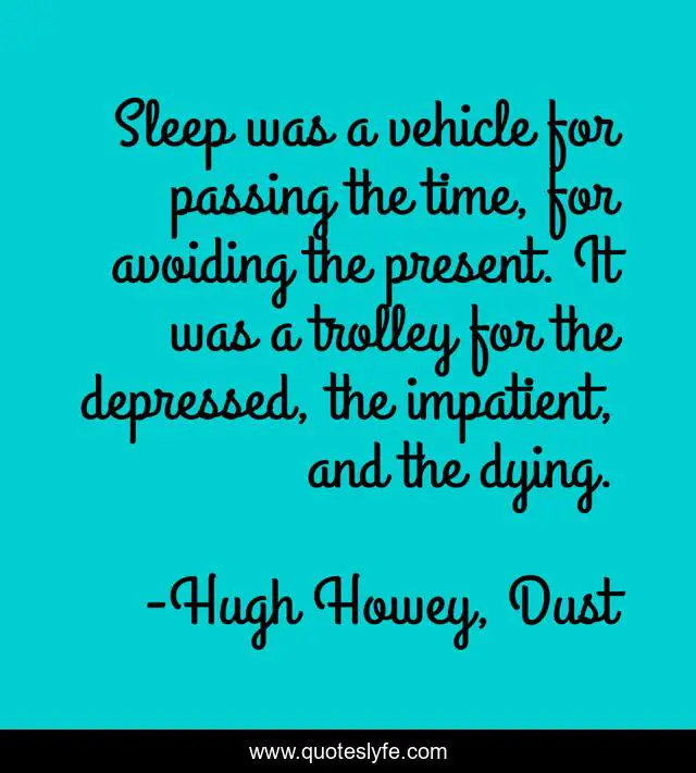 This page presents the quote "Sleep was a vehicle for passing the time, for avoiding the present. It was a trolley for the depressed, the impatient, and the dying.". Author of this quote is Hugh Howey, Dust. This quote is about sleep, depression,.