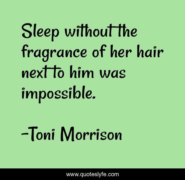 This page presents the quote "Sleep without the fragrance of her hair next to him was impossible.". Author of this quote is Toni Morrison. This quote is about impossible, lovers, sleep, fragrance,.