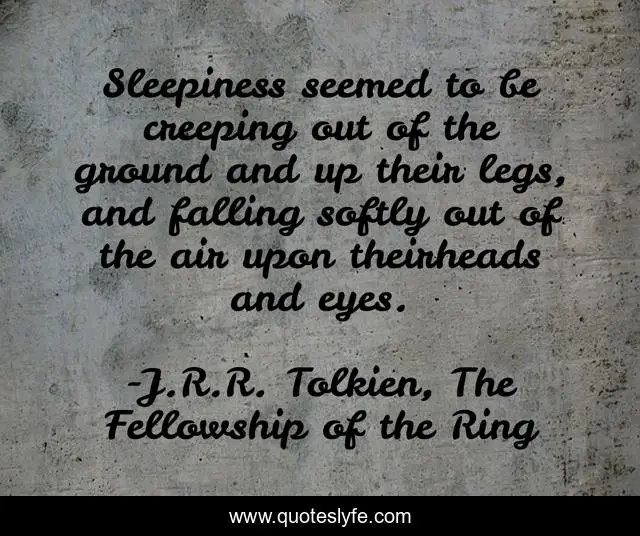 This page presents the quote "Sleepiness seemed to be creeping out of the ground and up their legs, and falling softly out of the air upon theirheads and eyes.". Author of this quote is J.R.R. Tolkien, The Fellowship of the Ring. This quote is about j-r-r-tolkien, sleep, the-lord-of-the-rings,.