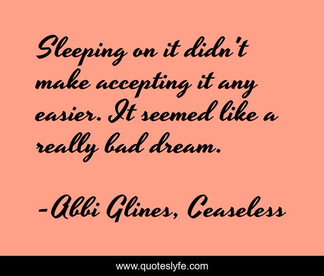 This page presents the quote "Sleeping on it didn't make accepting it any easier. It seemed like a really bad dream.". Author of this quote is Abbi Glines, Ceaseless. This quote is about heartache, accepting, reality, sleeping,.