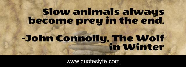 This page presents the quote "Slow animals always become prey in the end.". Author of this quote is John Connolly, The Wolf in Winter. This quote is about animals, prey,.