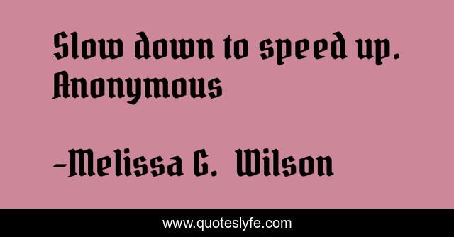This page presents the quote "Slow down to speed up. Anonymous". Author of this quote is Melissa G. Wilson. This quote is about enthusiasm, leadership, inspirational, social-science, novels,.