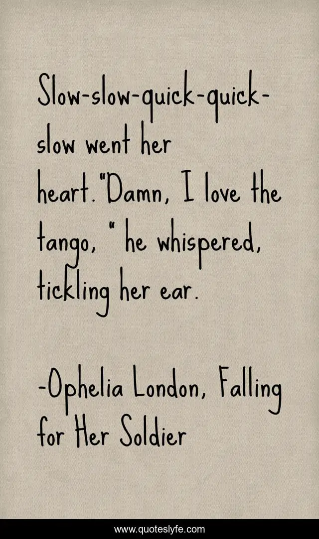 This page presents the quote "Slow-slow-quick-quick-slow went her heart.“Damn, I love the tango, ” he whispered, tickling her ear.". Author of this quote is Ophelia London, Falling for Her Soldier. This quote is about men-in-uniform, bliss, contemporary-romance, sweet-romance,.