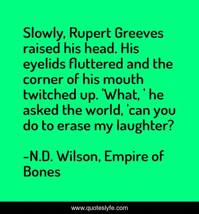 This page presents the quote "Slowly, Rupert Greeves raised his head. His eyelids fluttered and the corner of his mouth twitched up. 'What, ' he asked the world, 'can you do to erase my laughter?". Author of this quote is N.D. Wilson, Empire of Bones. This quote is about rupert-greeves, laughter,.