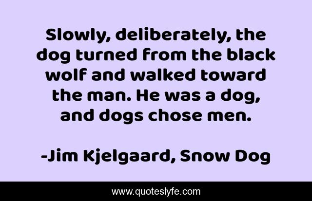 This page presents the quote "Slowly, deliberately, the dog turned from the black wolf and walked toward the man. He was a dog, and dogs chose men.". Author of this quote is Jim Kjelgaard, Snow Dog. This quote is about dog, wilderness, dogs,.