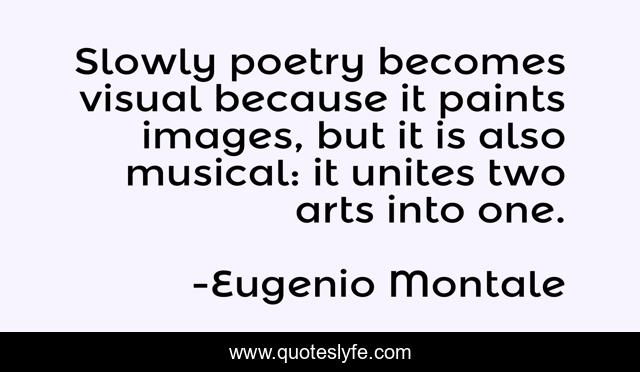 This page presents the quote "Slowly poetry becomes visual because it paints images, but it is also musical: it unites two arts into one.". Author of this quote is Eugenio Montale. This quote is about arts, visual, two,.