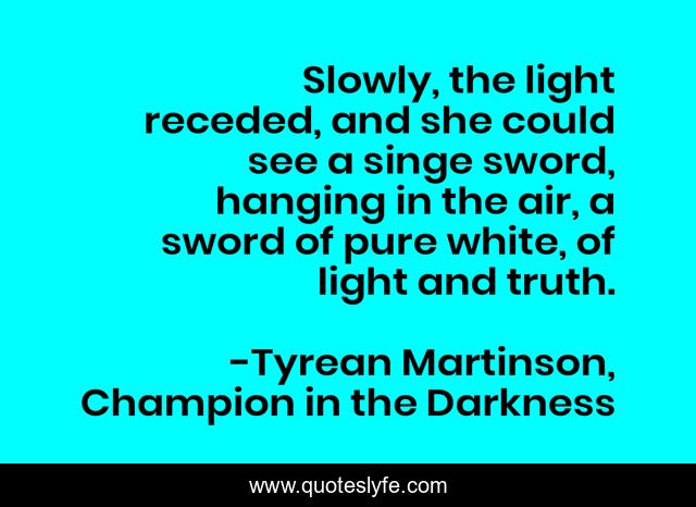 This page presents the quote "Slowly, the light receded, and she could see a singe sword, hanging in the air, a sword of pure white, of light and truth.". Author of this quote is Tyrean Martinson, Champion in the Darkness. This quote is about light, sword, truth,.