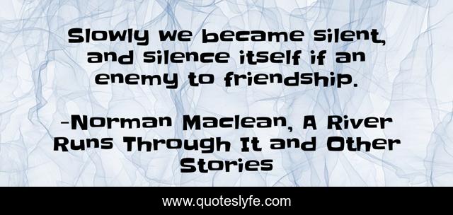 This page presents the quote "Slowly we became silent, and silence itself if an enemy to friendship.". Author of this quote is Norman Maclean, A River Runs Through It and Other Stories. This quote is about enemy, philosophy, friendship, friends, silence,.