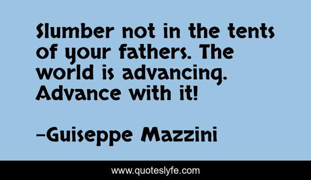 This page presents the quote "Slumber not in the tents of your fathers. The world is advancing. Advance with it!". Author of this quote is Guiseppe Mazzini. .