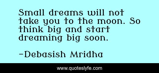 This page presents the quote "Small dreams will not take you to the moon. So think big and start dreaming big soon.". Author of this quote is Debasish Mridha. This quote is about life, love, knowledge, inspirational, intelligence, philosophy, wisdom, quotes, affection,.