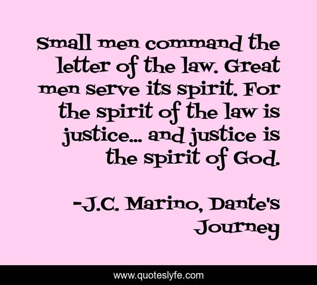 This page presents the quote "Small men command the letter of the law. Great men serve its spirit. For the spirit of the law is justice... and justice is the spirit of God.". Author of this quote is J.C. Marino, Dante's Journey. This quote is about fantasy, philosophical, epic,.