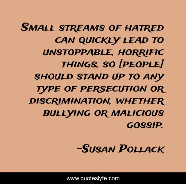 This page presents the quote "Small streams of hatred can quickly lead to unstoppable, horrific things, so [people] should stand up to any type of persecution or discrimination, whether bullying or malicious gossip.". Author of this quote is Susan Pollack. This quote is about equality, love, auschwitz, holocaust, bullying, inspirational, enthusiasm, hatred, affection,.