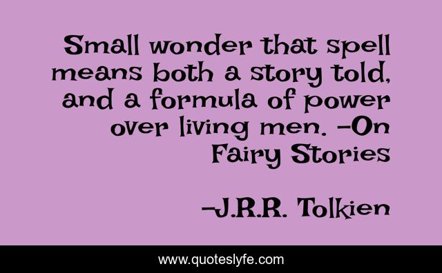 This page presents the quote "Small wonder that spell means both a story told, and a formula of power over living men. -On Fairy Stories". Author of this quote is J.R.R. Tolkien. This quote is about quotes, fairy, stories, form, spells,.