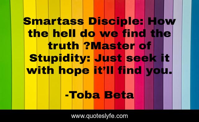 This page presents the quote "Smartass Disciple: How the hell do we find the truth ?Master of Stupidity: Just seek it with hope it’ll find you.". Author of this quote is Toba Beta. This quote is about humor, seek, find, truth,.