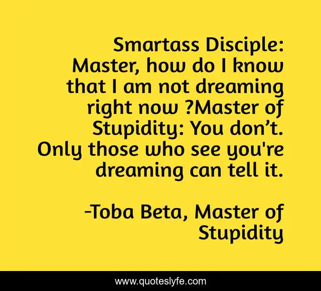 This page presents the quote "Smartass Disciple: Master, how do I know that I am not dreaming right now ?Master of Stupidity: You don’t. Only those who see you're dreaming can tell it.". Author of this quote is Toba Beta, Master of Stupidity. This quote is about dream, wake, world,.