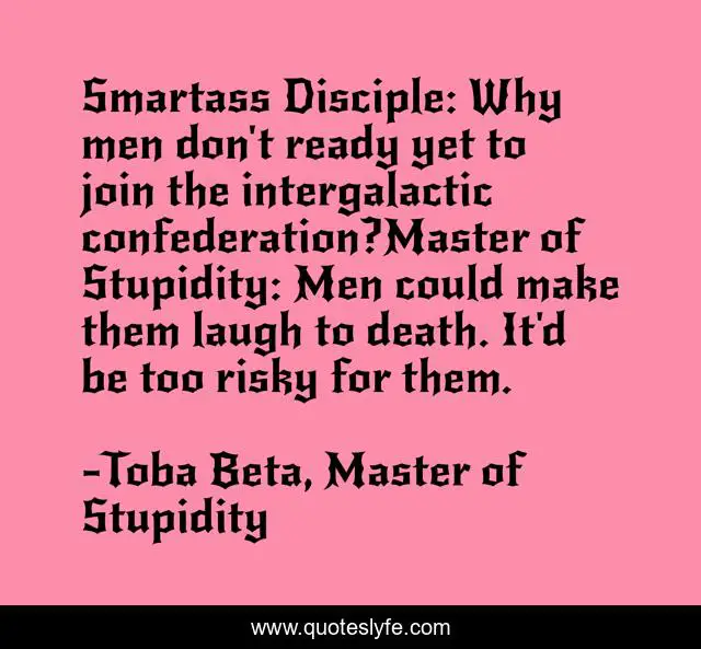 This page presents the quote "Smartass Disciple: Why men don't ready yet to join the intergalactic confederation?Master of Stupidity: Men could make them laugh to death. It'd be too risky for them.". Author of this quote is Toba Beta, Master of Stupidity. This quote is about funny, life, join, risk, intergalactic, comedy, confederation,.