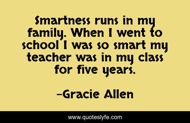 This page presents the quote "Smartness runs in my family. When I went to school I was so smart my teacher was in my class for five years.". Author of this quote is Gracie Allen. This quote is about intelligence, school, family,.