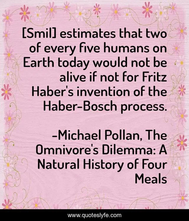 This page presents the quote "[Smil] estimates that two of every five humans on Earth today would not be alive if not for Fritz Haber's invention of the Haber-Bosch process.". Author of this quote is Michael Pollan, The Omnivore's Dilemma: A Natural History of Four Meals. .