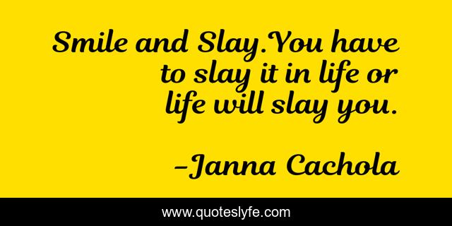 This page presents the quote "Smile and Slay.You have to slay it in life or life will slay you.". Author of this quote is Janna Cachola. This quote is about motivation, power, power-of-thoughts, girl-power, win, guts, boss, behaviour, entrepreneur,.