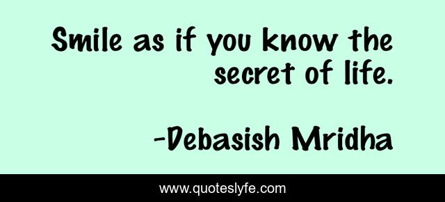This page presents the quote "Smile as if you know the secret of life.". Author of this quote is Debasish Mridha. This quote is about life, love, knowledge, inspirational, intelligence, philosophy, wisdom, quotes, affection,.
