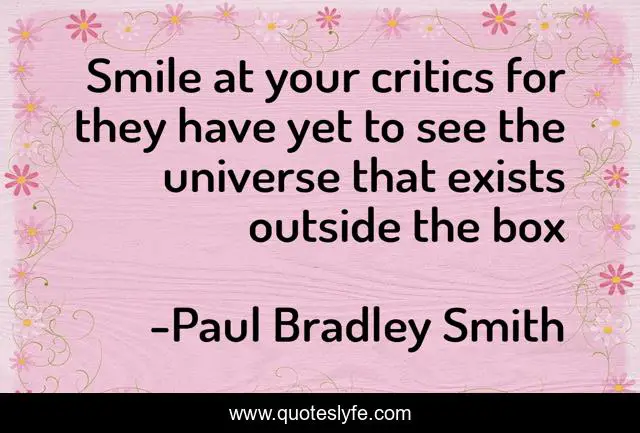 This page presents the quote "Smile at your critics for they have yet to see the universe that exists outside the box". Author of this quote is Paul Bradley Smith. This quote is about critics, smile, outside-the-box, happiness, creative,.