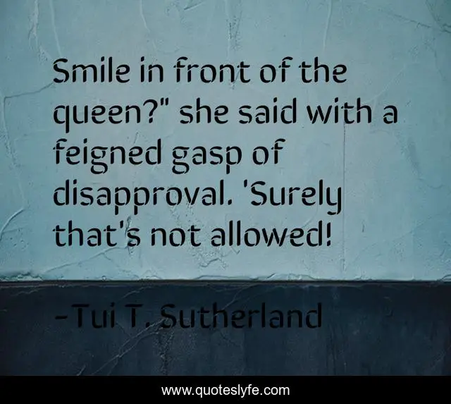 This page presents the quote "Smile in front of the queen?" she said with a feigned gasp of disapproval. 'Surely that's not allowed!". Author of this quote is Tui T. Sutherland. This quote is about darkstalker, dragons, wings-of-fire, fiction,.