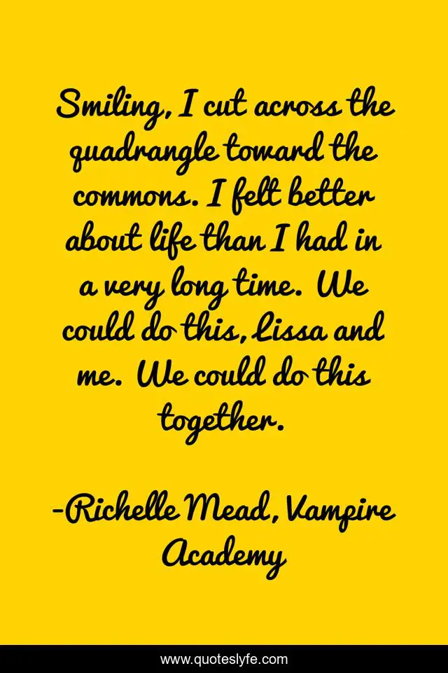 This page presents the quote "Smiling, I cut across the quadrangle toward the commons. I felt better about life than I had in a very long time. We could do this, Lissa and me. We could do this together.". Author of this quote is Richelle Mead, Vampire Academy. This quote is about romance, fiction,.