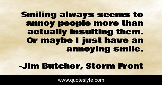 This page presents the quote "Smiling always seems to annoy people more than actually insulting them. Or maybe I just have an annoying smile.". Author of this quote is Jim Butcher, Storm Front. This quote is about annoy, humorous, smiling, insulting,.