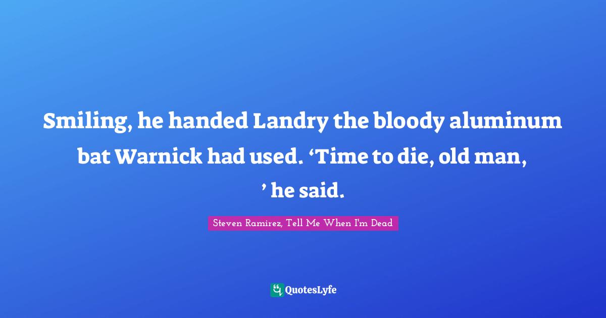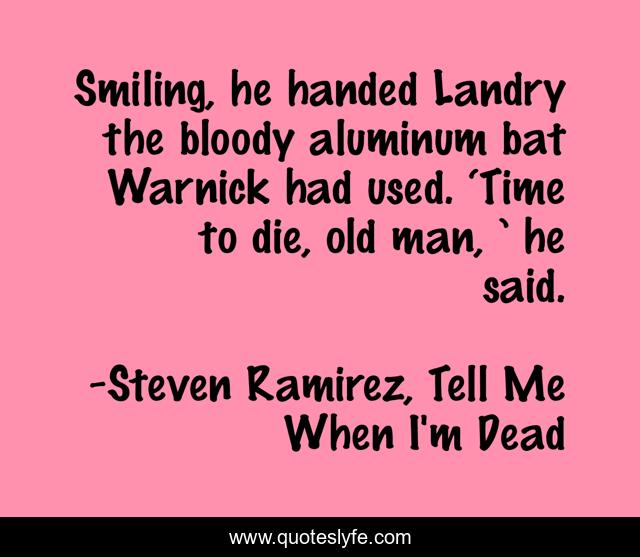 This page presents the quote "Smiling, he handed Landry the bloody aluminum bat Warnick had used. ‘Time to die, old man, ’ he said.". Author of this quote is Steven Ramirez, Tell Me When I'm Dead. This quote is about drunk, novel, dead, zombie-thriller, soldiers, paranormal-thriller, horde, na, hordes,.