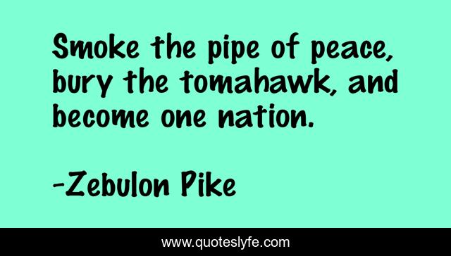 This page presents the quote "Smoke the pipe of peace, bury the tomahawk, and become one nation.". Author of this quote is Zebulon Pike. This quote is about become, smoke, nation,.