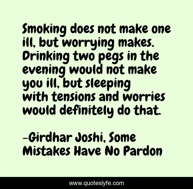 This page presents the quote "Smoking does not make one ill, but worrying makes. Drinking two pegs in the evening would not make you ill, but sleeping with tensions and worries would definitely do that.". Author of this quote is Girdhar Joshi, Some Mistakes Have No Pardon. This quote is about smoking, drinking, illness, worry,.
