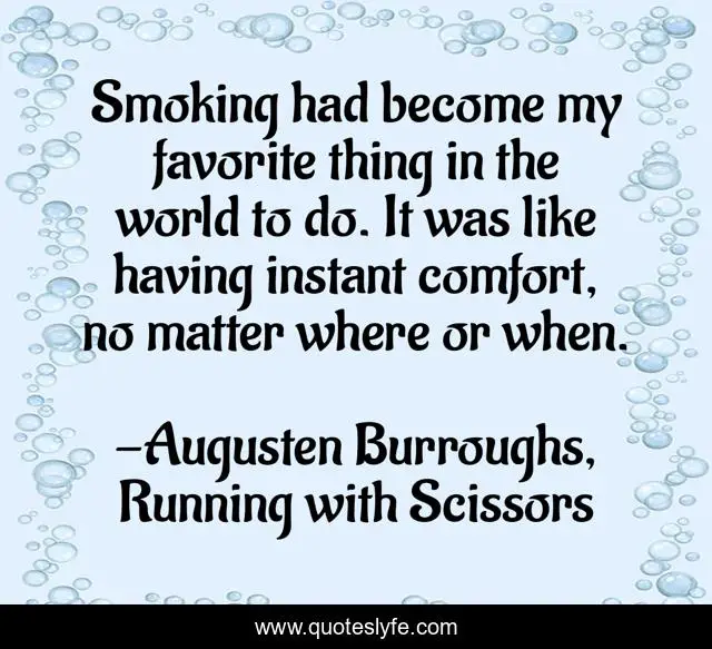 "Augusten Burroughs, Running with Scissors Quotes." Quoteslyfe.com, 2025. Mon. 08 Dec. 2025. <https://www.quoteslyfe.com/quote/Smoking-had-become-my-favorite-thing-in-230183>.