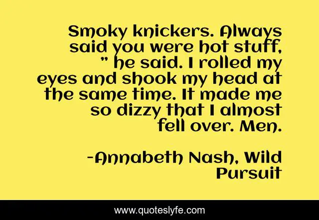 This page presents the quote "Smoky knickers. Always said you were hot stuff, ” he said. I rolled my eyes and shook my head at the same time. It made me so dizzy that I almost fell over. Men.". Author of this quote is Annabeth Nash, Wild Pursuit. This quote is about mystery, romance, humour,.