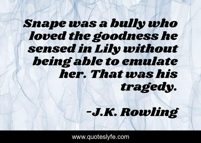 This page presents the quote "Snape was a bully who loved the goodness he sensed in Lily without being able to emulate her. That was his tragedy.". Author of this quote is J.K. Rowling. .