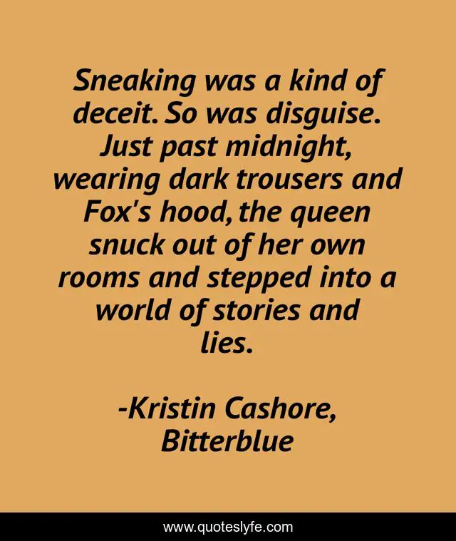 This page presents the quote "Sneaking was a kind of deceit. So was disguise. Just past midnight, wearing dark trousers and Fox's hood, the queen snuck out of her own rooms and stepped into a world of stories and lies.". Author of this quote is Kristin Cashore, Bitterblue. This quote is about lies, midnight, stories,.