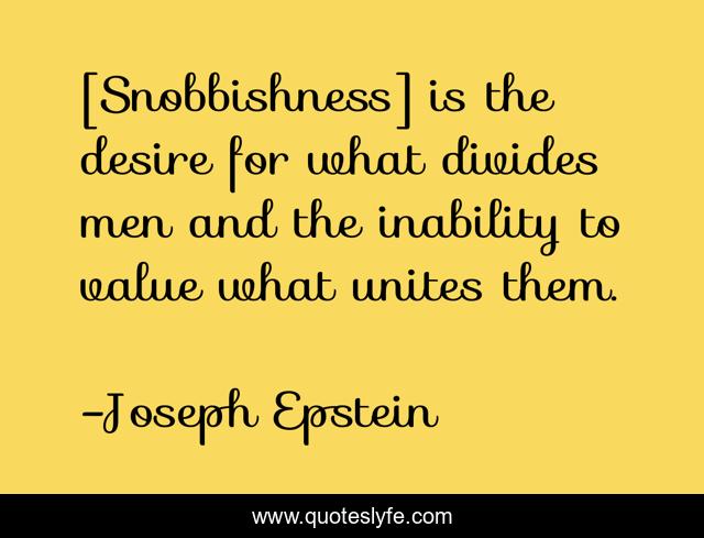 This page presents the quote "[Snobbishness] is the desire for what divides men and the inability to value what unites them.". Author of this quote is Joseph Epstein. This quote is about human-nature, snobbery,.
