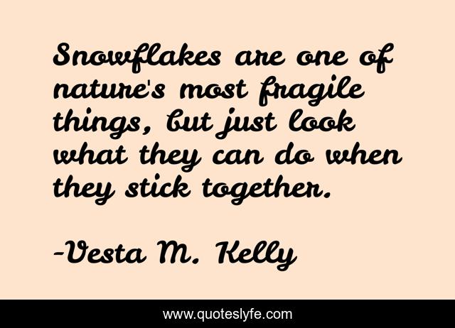 This page presents the quote "Snowflakes are one of nature's most fragile things, but just look what they can do when they stick together.". Author of this quote is Vesta M. Kelly. This quote is about snowflakes, nature, fragile, snow, teamwork, sticking-together,.