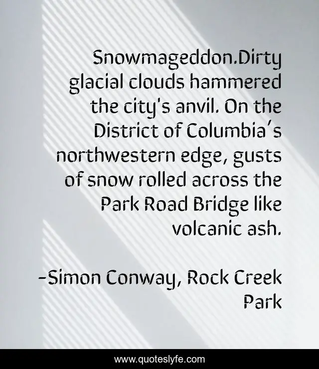 "Simon Conway, Rock Creek Park Quotes." Quoteslyfe.com, 2025. Mon. 08 Dec. 2025. <https://www.quoteslyfe.com/quote/Snowmageddon-Dirty-glacial-clouds-hammered-the-city-200733>.
