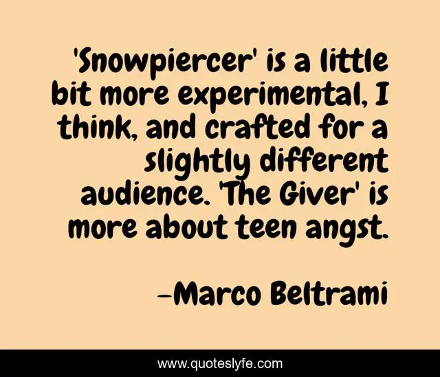 This page presents the quote "'Snowpiercer' is a little bit more experimental, I think, and crafted for a slightly different audience. 'The Giver' is more about teen angst.". Author of this quote is Marco Beltrami. This quote is about audience, little, think,.