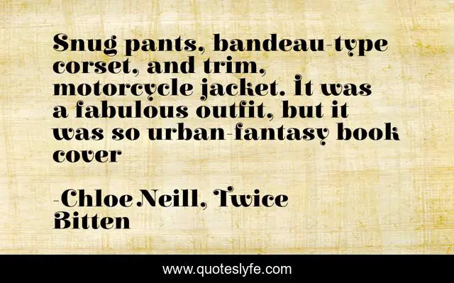 This page presents the quote "Snug pants, bandeau-type corset, and trim, motorcycle jacket. It was a fabulous outfit, but it was so urban-fantasy book cover". Author of this quote is Chloe Neill, Twice Bitten. This quote is about leather, humor, urban-fantasy, vampires,.