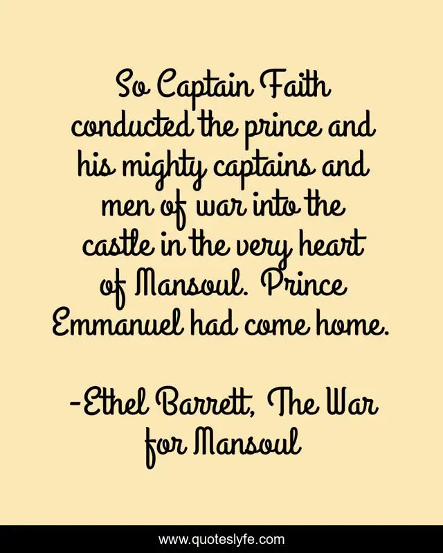 This page presents the quote "So Captain Faith conducted the prince and his mighty captains and men of war into the castle in the very heart of Mansoul. Prince Emmanuel had come home.". Author of this quote is Ethel Barrett, The War for Mansoul. This quote is about faith, john-bunyan, emmanuel, prince, mansoul, salvation, war,.