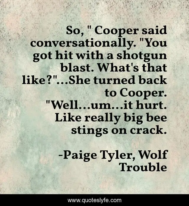 This page presents the quote "So, " Cooper said conversationally. "You got hit with a shotgun blast. What's that like?"...She turned back to Cooper. "Well...um...it hurt. Like really big bee stings on crack.". Author of this quote is Paige Tyler, Wolf Trouble. This quote is about shifters-romance, romantic-suspense,.