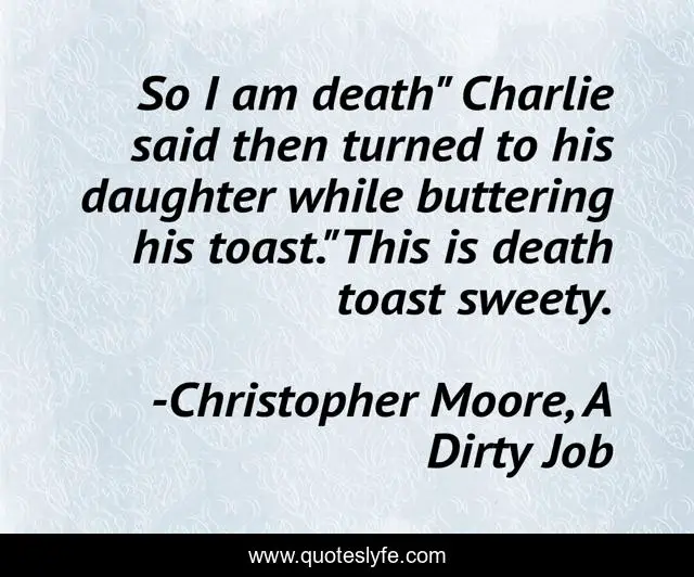 This page presents the quote "So I am death" Charlie said then turned to his daughter while buttering his toast."This is death toast sweety.". Author of this quote is Christopher Moore, A Dirty Job. This quote is about fantasy, humor,.